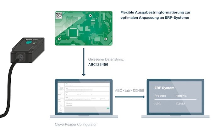 The output string can be adapted to feed the reading result directly into the ERP system. Additional functions such as automatic error image memory, match code, and various reading modes extend the range of applications. The high-performance version VOI1100 recognizes codes in motion up to 3.5 m/s as well as directly applied codes (Direct Part Marking, DPM); the basic version VOI1000 reads reliably in static applications. Its unique price-performance ratio makes the CleverReader a particularly cost-effective solution in its class.